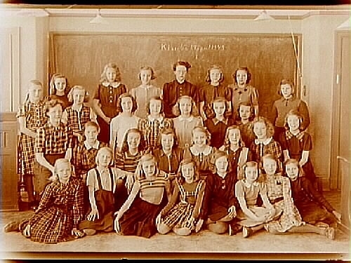 Titel: Engelbrektsskolan, klassrumsinteriör, 29 skolflickor med lärarinna fru Greta Tener, klass 6e, sal 23.