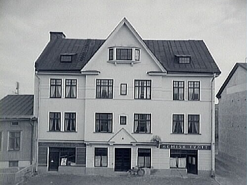 Trevånings bostadshus med frontespis, affärslokaler i gatuplanet.