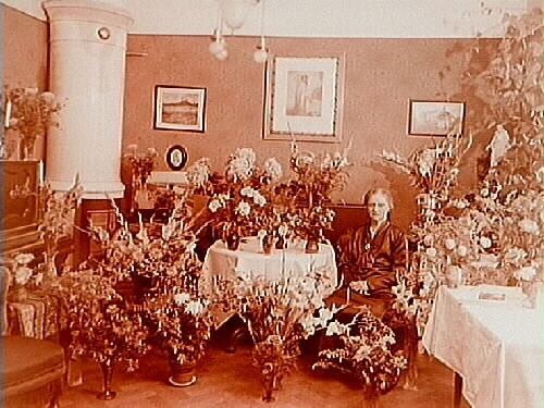 Titel: Fröken Sofia Anderssons 80 årsdag. Rumsinteriör, en äldre kvinna.