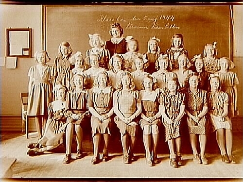 Vasaskolan, klassrumsinteriör, 23 flickor med lärarinna fröken Karin Sahlin, klass 6, sal 22.