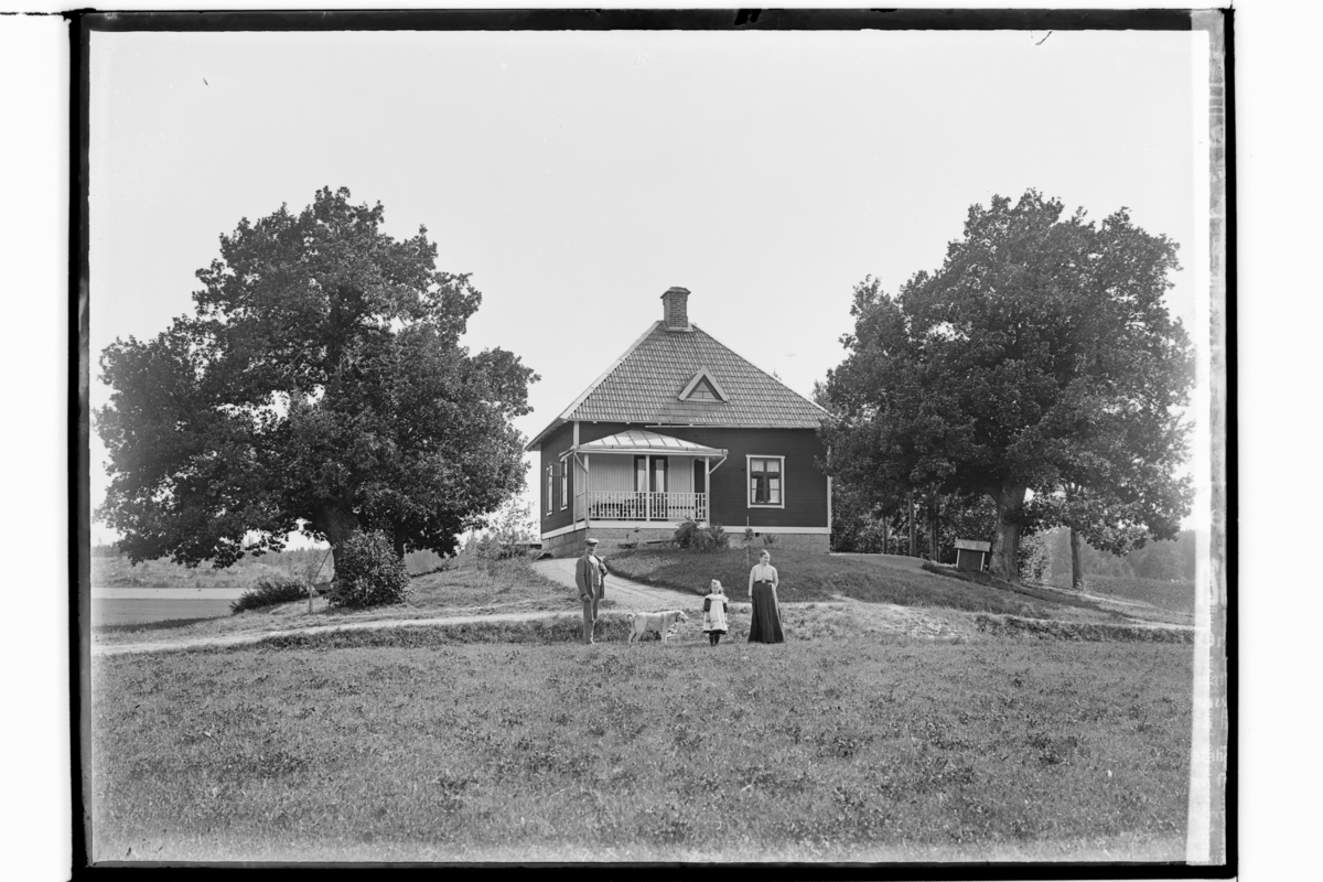 Envånings bostadshus, familjegrupp tre personer och en hund framför huset.