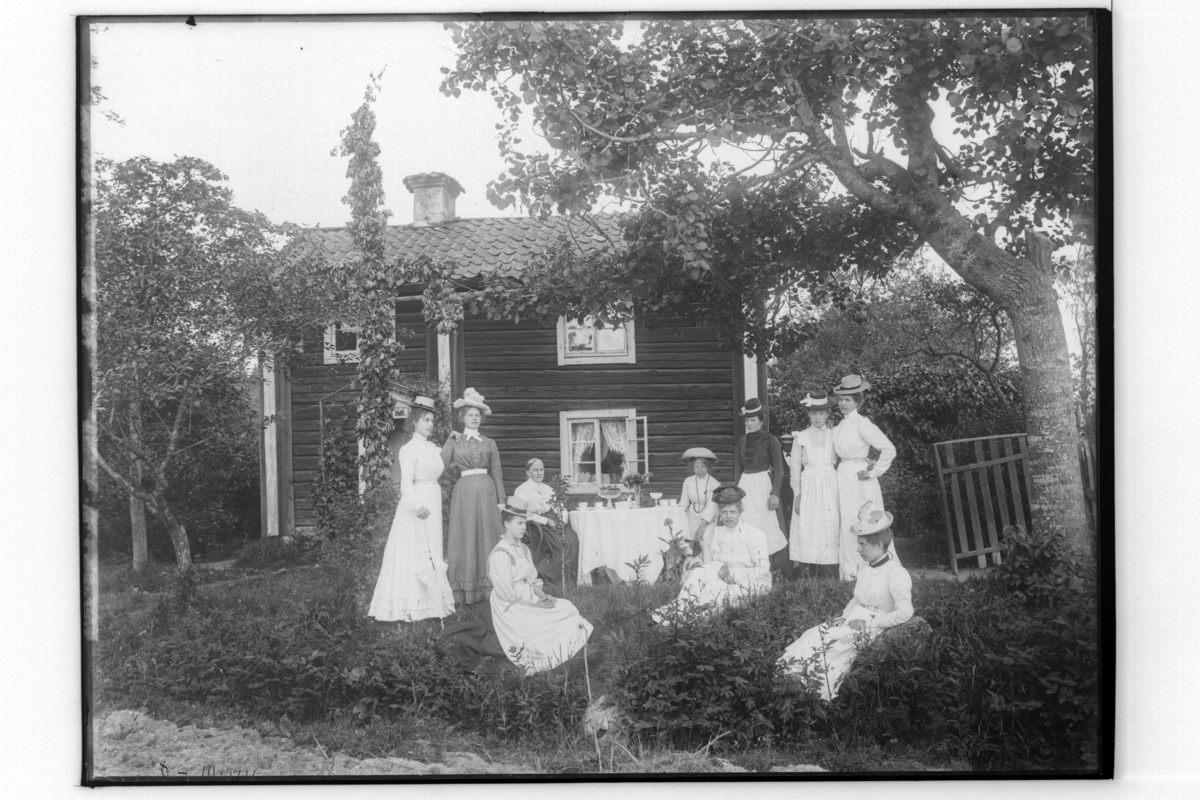 Grupp vid Stolts stuga, 10 personer vid kaffebordet.