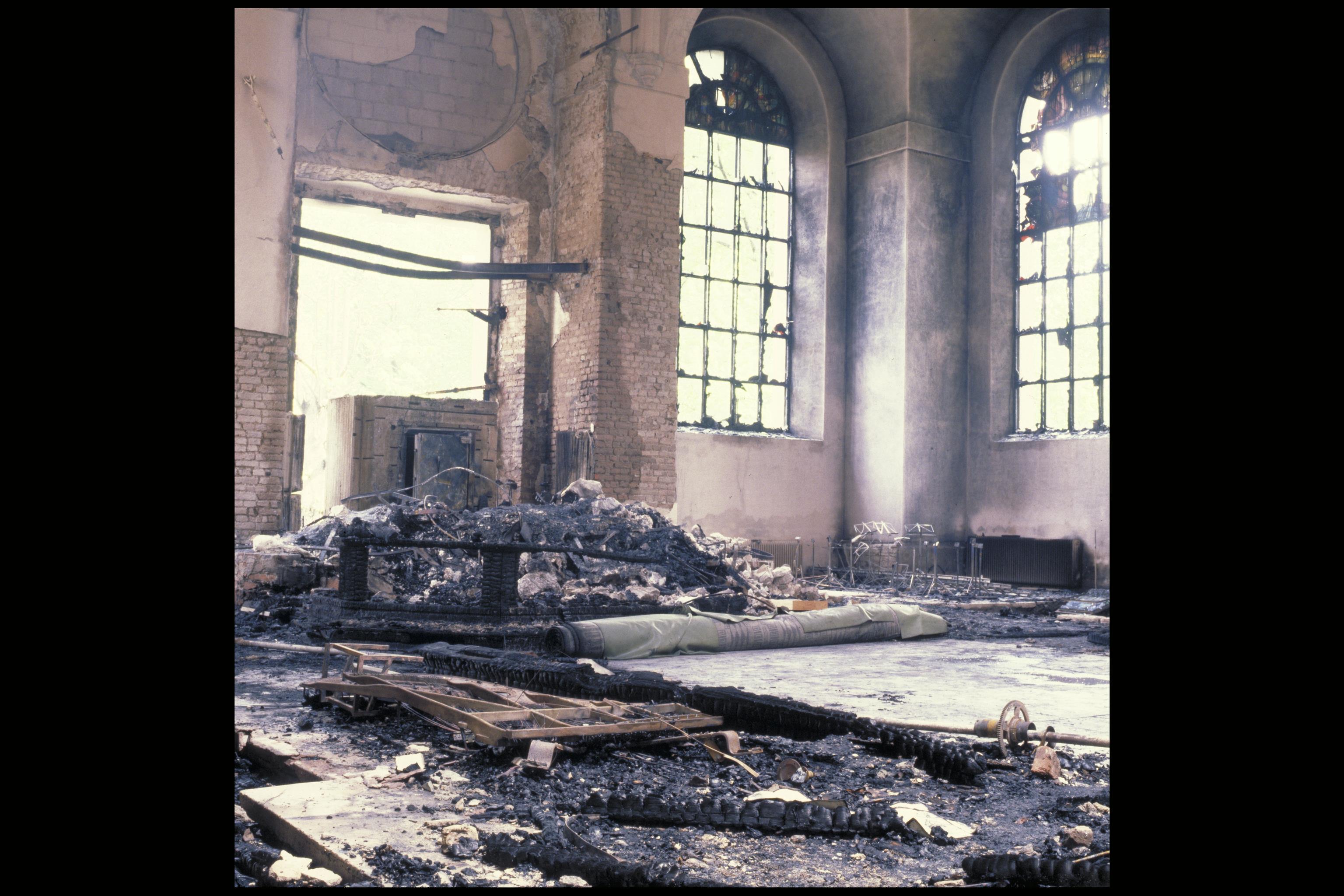 Beskrivning: Interirörbild inifrån kyrkan efter branden den 17 maj 1990.