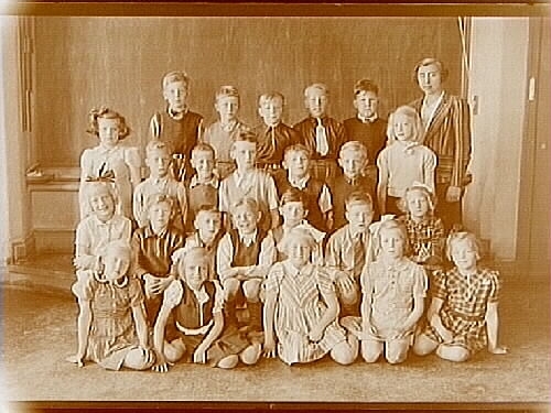 Engelbrektsskolan, klassrumsinteriör, 24 skolbarn med lärarinna fru Eva Dahlin, sal 8.