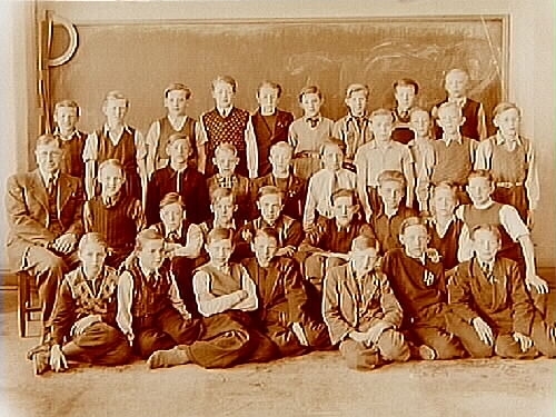 Engelbrektsskolan, klassrumsinteriör, 32 skolpojkar med lärare B. Edberg, klass 6, sal 19.