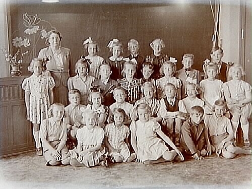 Engelbrektsskolan, klassrumsinteriör, 26 skolbarn med lärarinna fröken Astrid Vidén, sal 16.