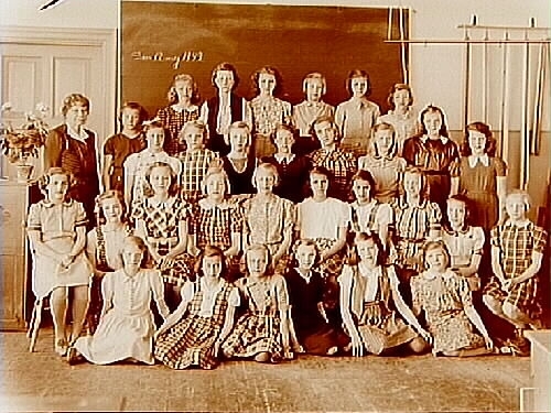 Vasaskolan, klassrumsinteriör, 31 flickor med lärarinna fröken Karin Velinder, sal 15.