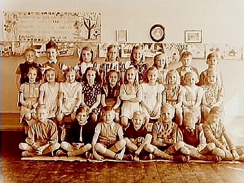 Vasaskolan, klassrumsinteriör, 25 skolbarn med lärarinna fröken Märta Ljungdahl, klass 2n, sal 1.