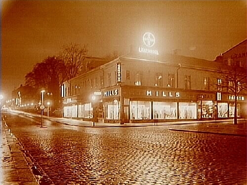 Tvåvånings hörnfastighet med följande affärer: EPA, Liberty, Walén 6 Co, Centrum Musik Kafé, Mills Herrekipering, Tobak, Handarbeten.