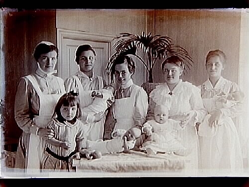 Fyra mödrar med nyfödda barn, barnsköterska med en liten flicka.