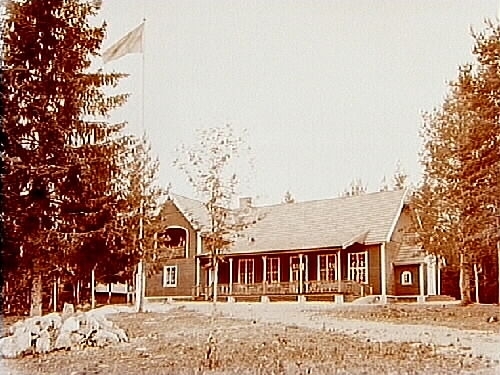 Vinkelbyggd en och en halvvånings träbyggnad.