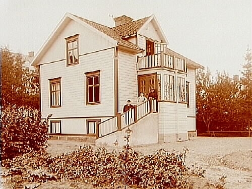 En och en halvvånings bostadshus med balkong och glasad förstubro.