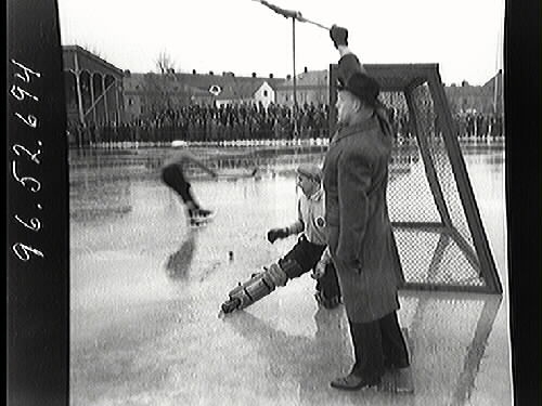 Sverige gör ett av sina mål. Gösta Pettersson känd som lagledare i ÖSK fotboll vinkar mål.