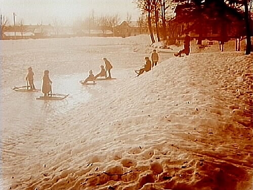 Stora Holmen, nio barn med kälkar och sparkstöttingar i backen ner mot den frusna Svartån.