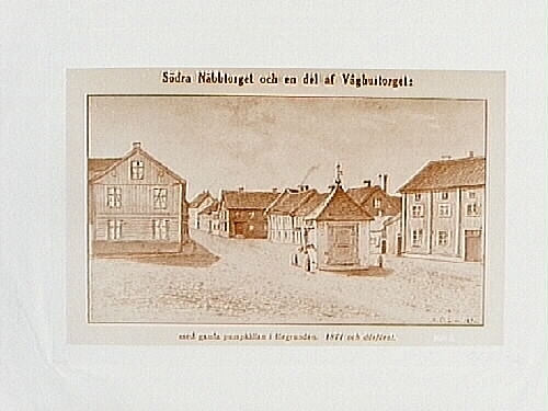 Södra Näbbtorget och en del av Våghustorget med gamla pumpkällan i förgrunden.