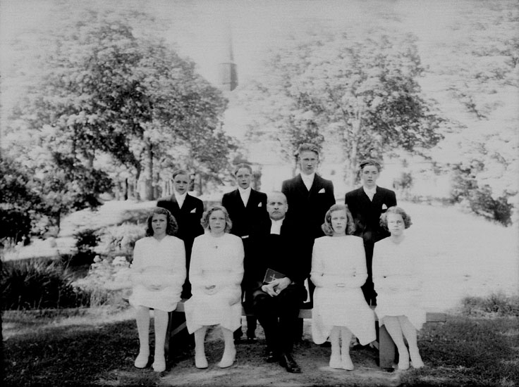 8 konfirmander, 4 flickor, 4 pojkar och kyrkoherde Gösta Sköldebrand.