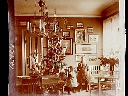 Titel: Rumsinteriör, två barn vid julgranen, Märta och Margit Lindskog. Sam Lindskogs privata bilder.