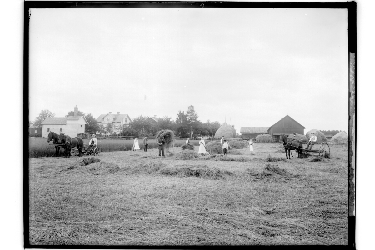 Höslåtter. 10 personer, 2 hästar för slåttermaskin, 1 häst för hästräffsa. En och en halv plans bostadshus och ekonomibyggnader.