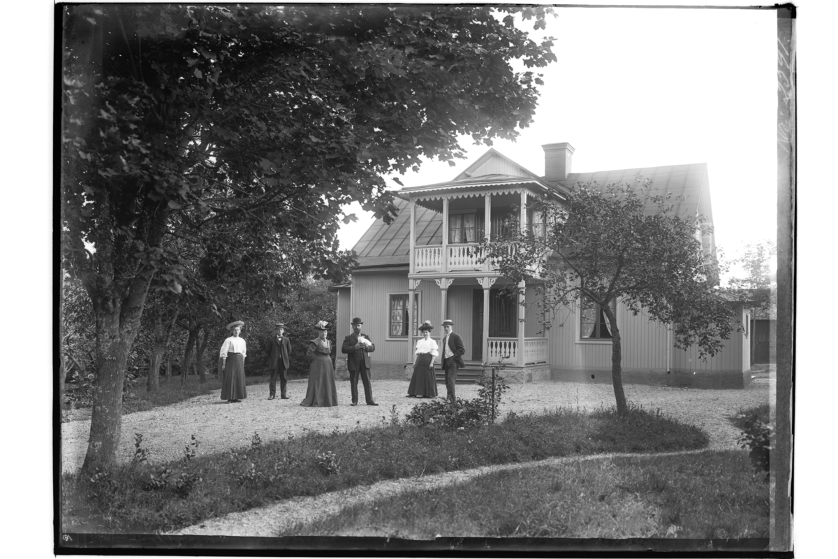 Envånings bostadshus med inredd vind, takhuv, balkong och förstebro i snickarglädje. 6 personer framför huset.