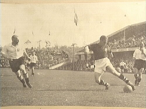 Prosten Karlsson AIK dribblad av Sten Dahl ÖSK och Klämmen Pettersson.