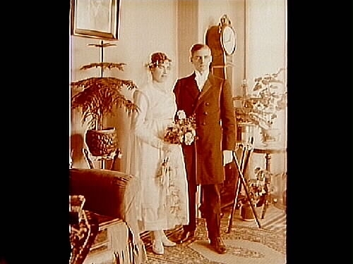 Brudpar, bruden helt i vitt, brudgummen i bonjour.