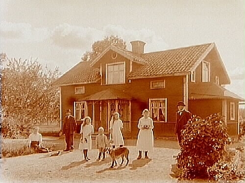 7 personer och en hund framför huset.