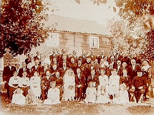 Bröllop. Brudpar och bröllopsgäster och prosten Gustaf Rosell. Bruden helt i vitt.