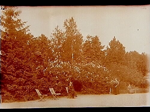 Tre kvinnor i trädgården.