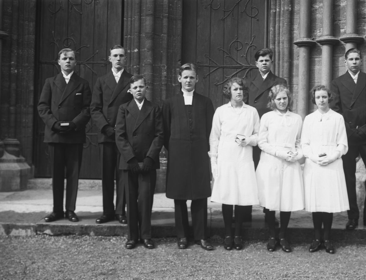 Titel: Dövstumskolan, Sturegatan 3, Örebro. Konfirmander, 3 flickor, 5 pojkar och pastor Areskog framför kyrkan.