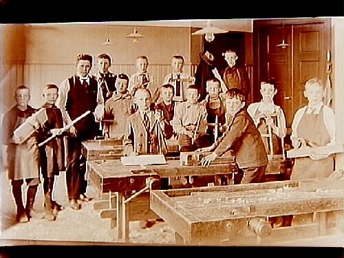Norra Folkskolan, interiör av träslöjdsalen, 14 skolpojkar och folkskollärare Gustaf Tillas.