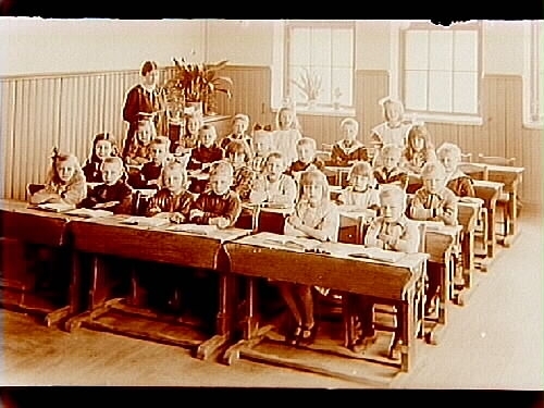 Rudbecksskolan, klassrumsinteriör, 24 skolbarn i sina bänkar. Skolfröken Astrid Vidén.