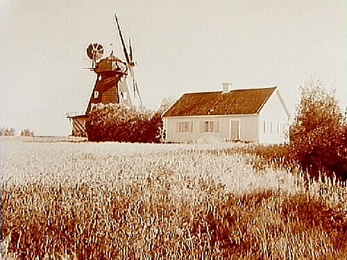 Sandåkers kvarn, envånings bostadshus i förgrunden, fornstugan.