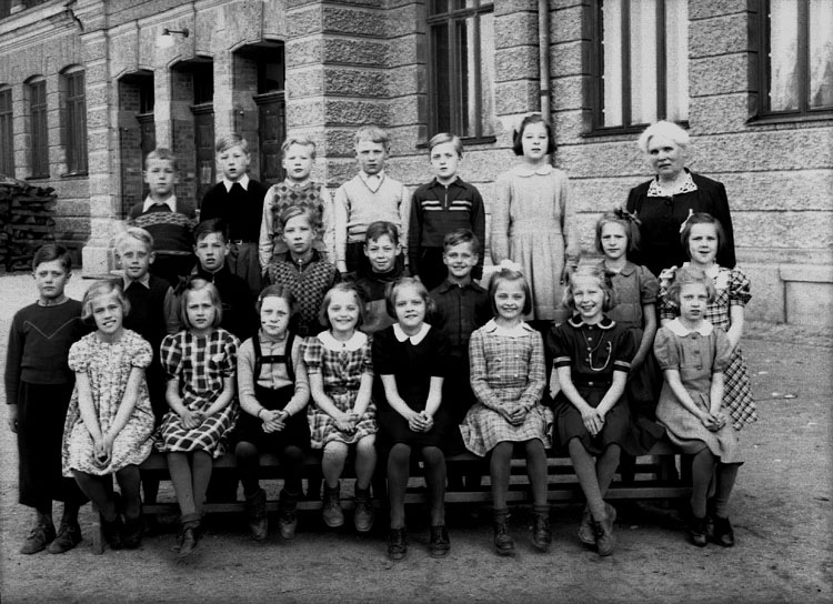 Vasaskolan, 22 skolbarn med lärarinna fröken Hildur Johansson på skolgården.