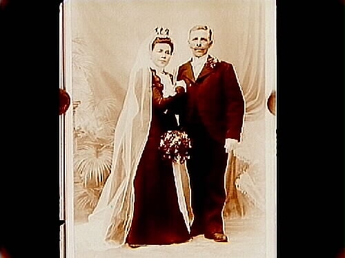 Brudpar, bruden i svart klänning och vit slöja, brudgummen i frack.