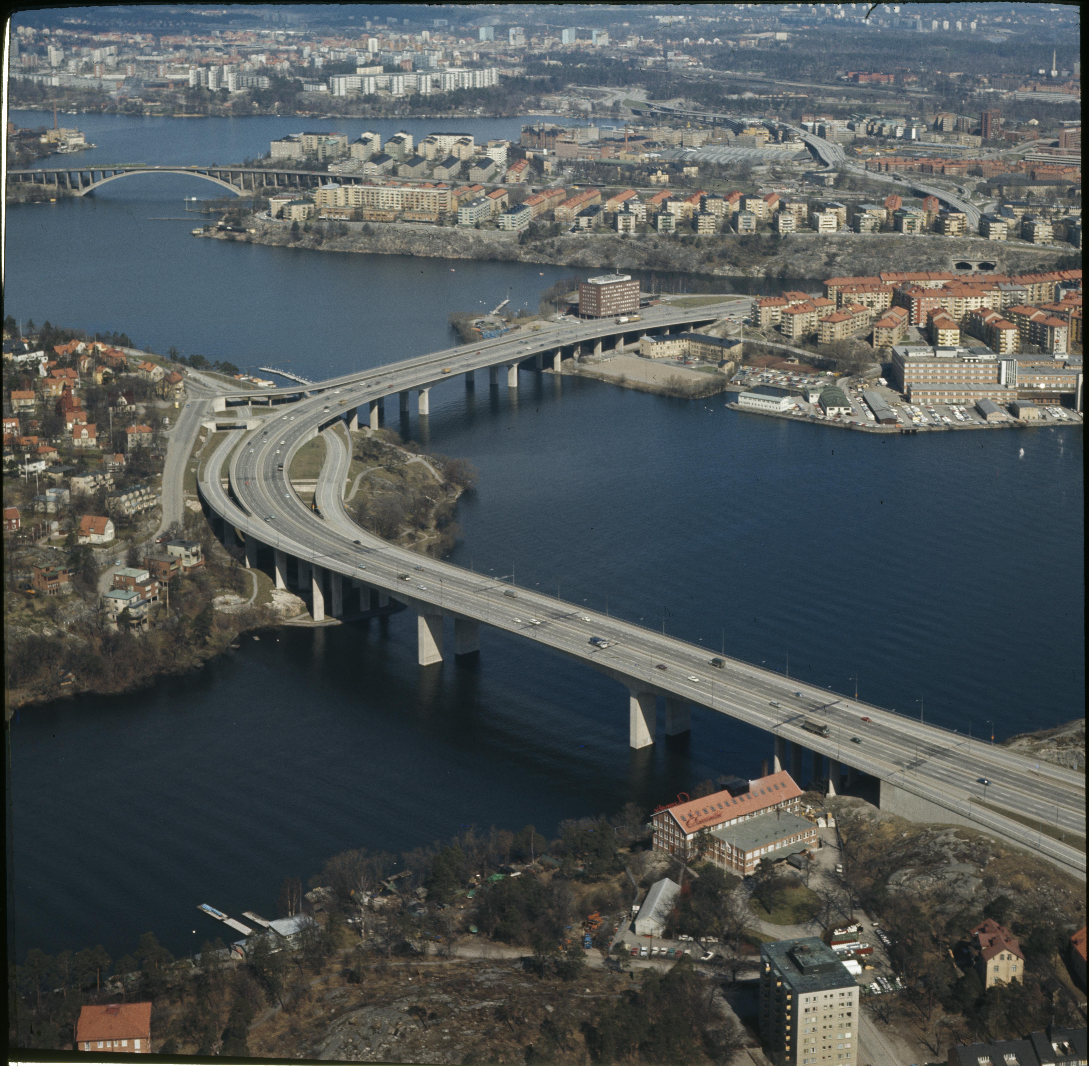 Essingebron och Essingeöarna. Essingeleden. I bakgrunden Kungsholmen.