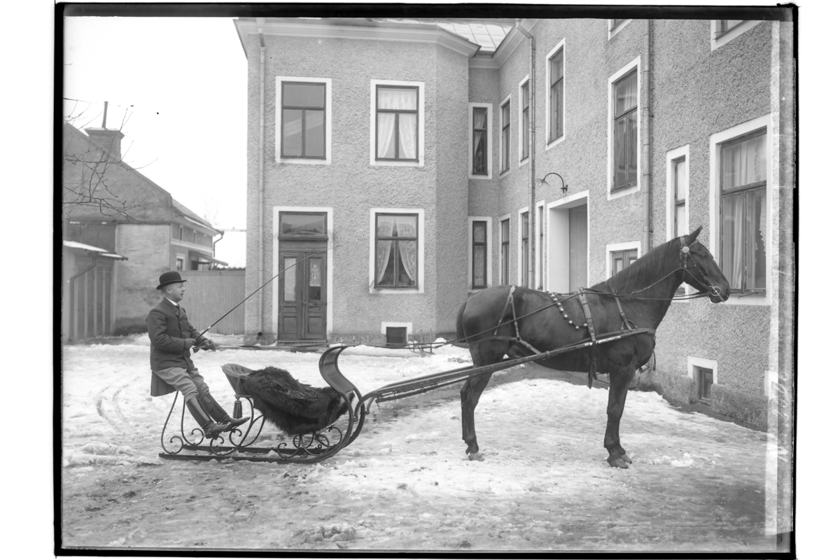 Häst och släde, en man.