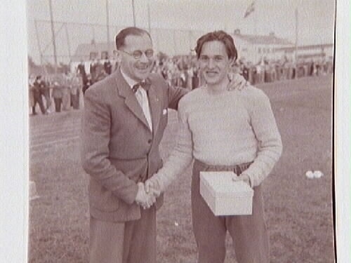 Friidrott Örnsro Idrottspark. NIF-ordförande Curt Hedberg gratulerar Per-Arne till segern.