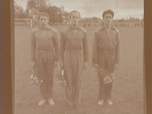 Tre tävlande med blomsterbukett. T.v Sotarn Jönsson mitten Henry Eriksson T.h Olle Åberg.