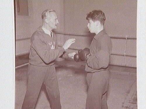 Boxning; Idrottshuset 1948. Artur Koch tränar Rolf Svanberg, BK Kelly.