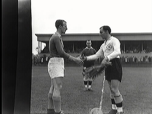 ÖSK mot Oslo. Sten Dahl hälsar lagkaptenen i Oslo välkommen med en blomsterkvast.