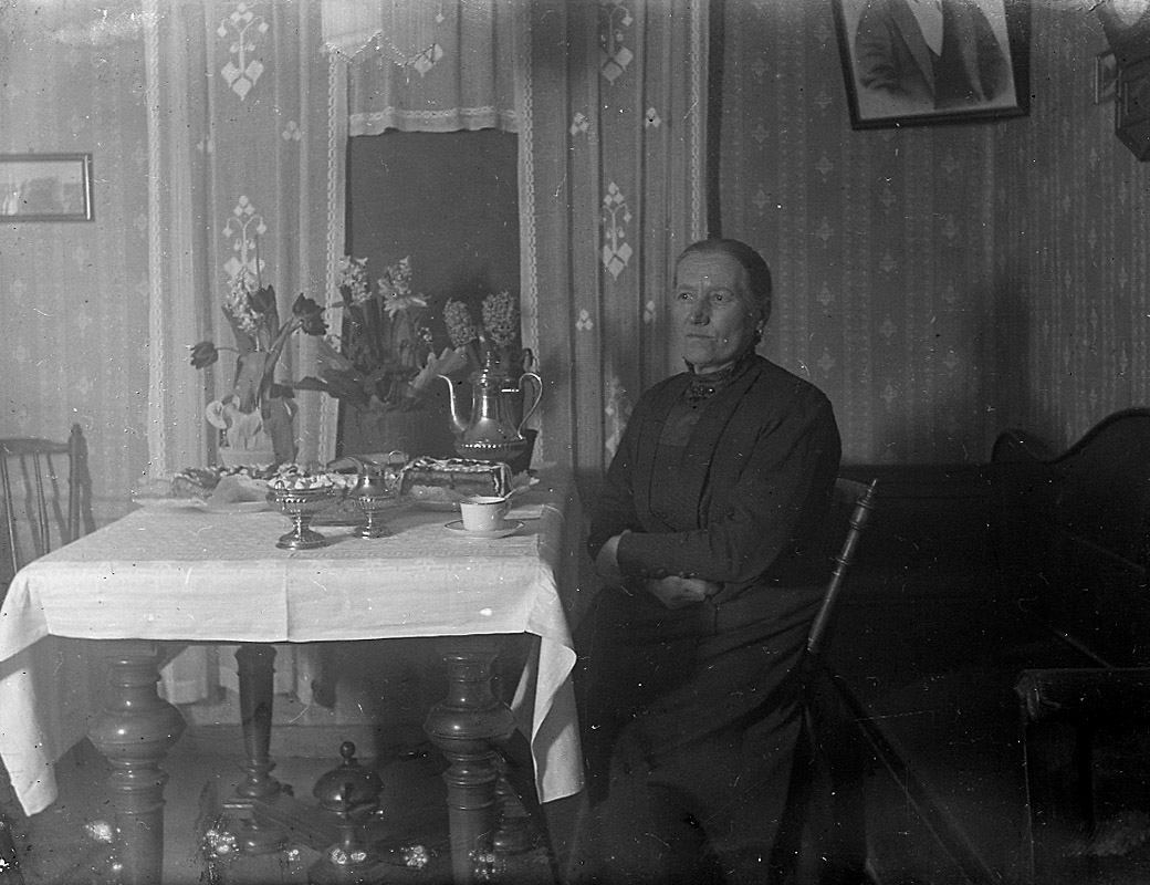 Rumsinteriör, en kvinna vid bordet.
