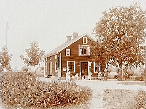 En och en halvplans bostadshus, handelsbod, 7 personer utanför.