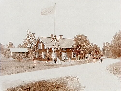 En och en halvplans bostadshus, handelsbod, 5 personer utanför byggnaden, en person med en häst på vägen.