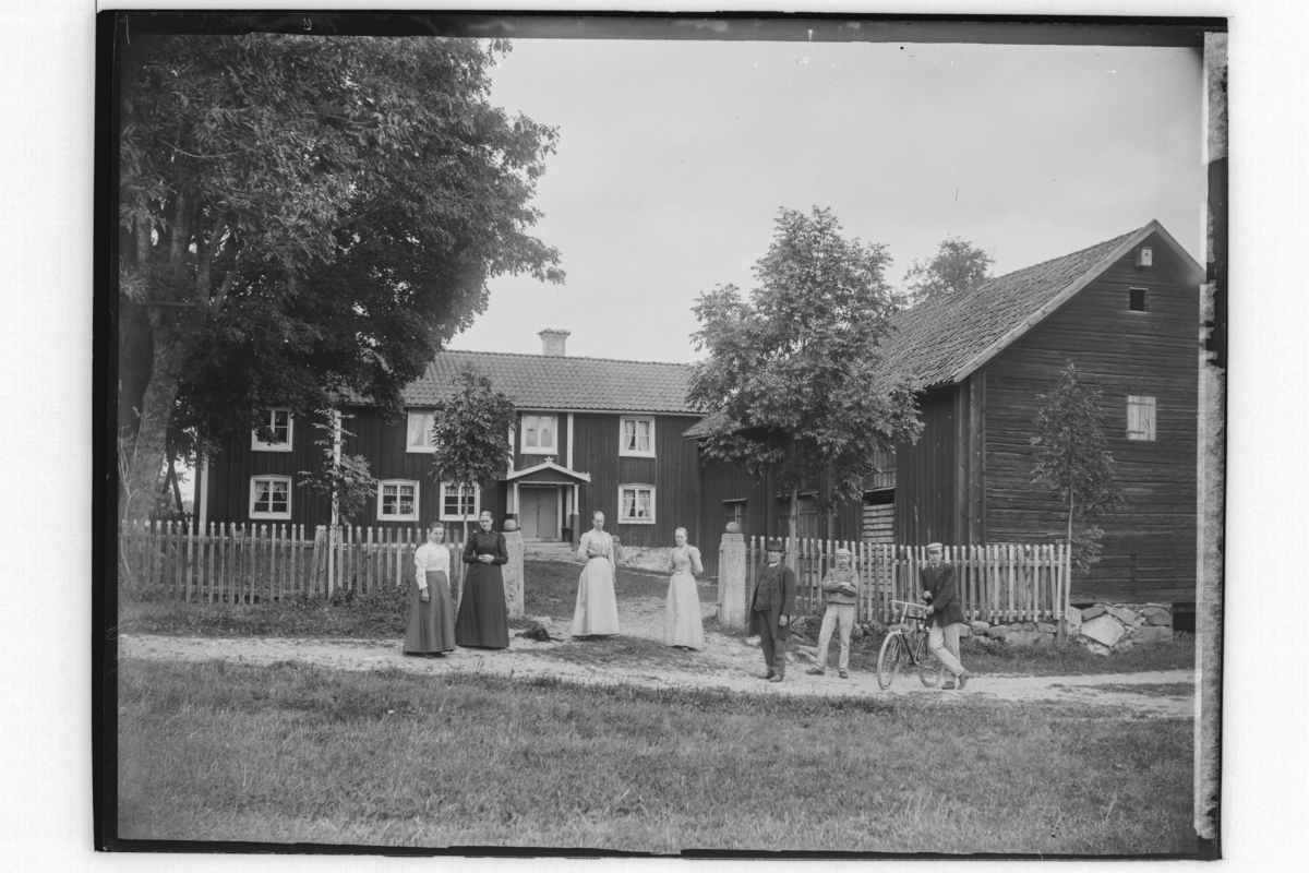 Byggnader, 7 personer, en med cykel. Forkammarstuga i två våningar och uthus.