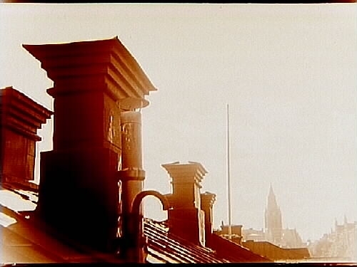 Utsikt över byggnadstak, kyrka i bakgrunden.