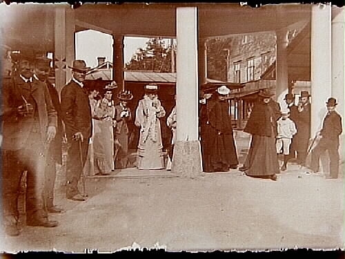 Titel: Porla Brunn, byggnaden och brunnsbesökare.
