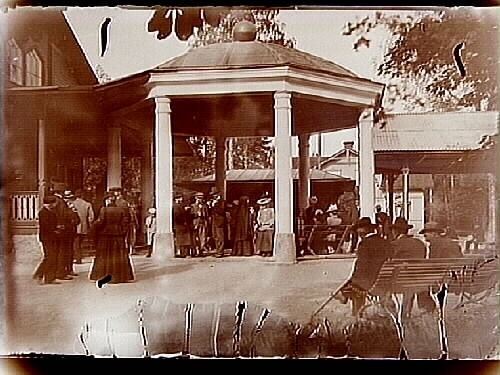 Porla Brunn, byggnaden och brunnsbesökare.