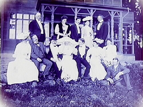 Bostadshus, grupp 13 personer framför huset.