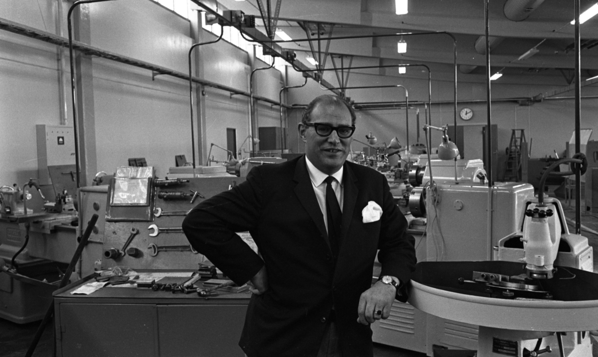 Rektor Runar Dahlin vid statens vuxenskola för omskolning, Bettorpsgatan 10. Han står i verkstadslokalen i kavajkostym med näsduk i bröstfickan.