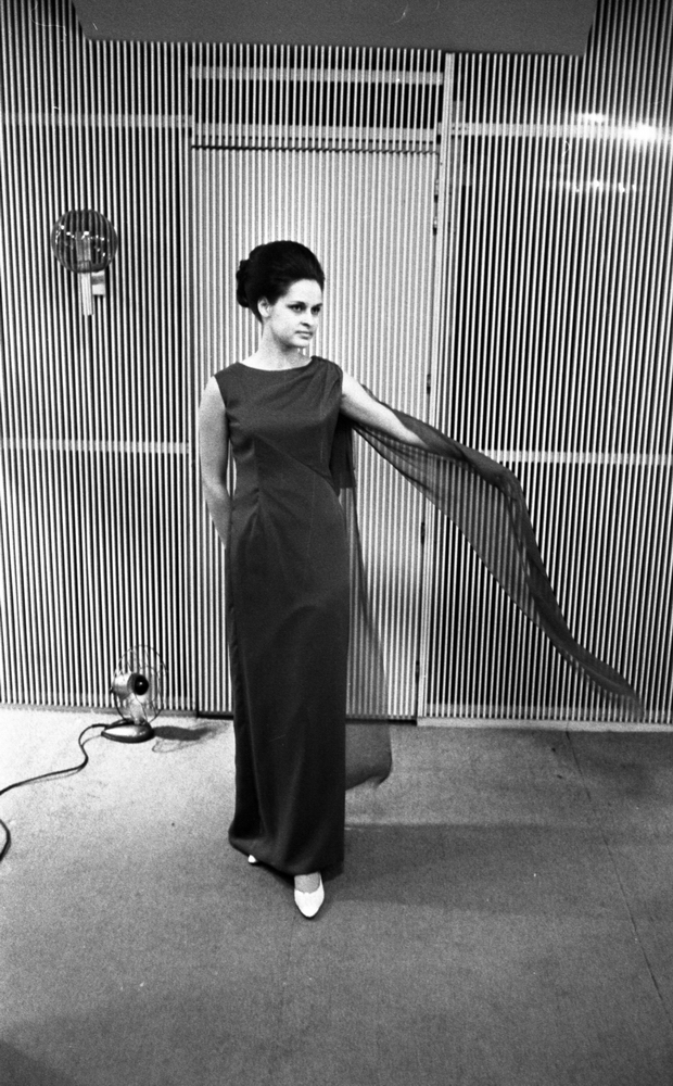 En mannekäng iförd lång klänning med hängande tygstycken på samt vita pumps. En fläkt står bakom henne till vänster på golvet. En lampa hänger på väggen. En dörr är precis bakom henne.